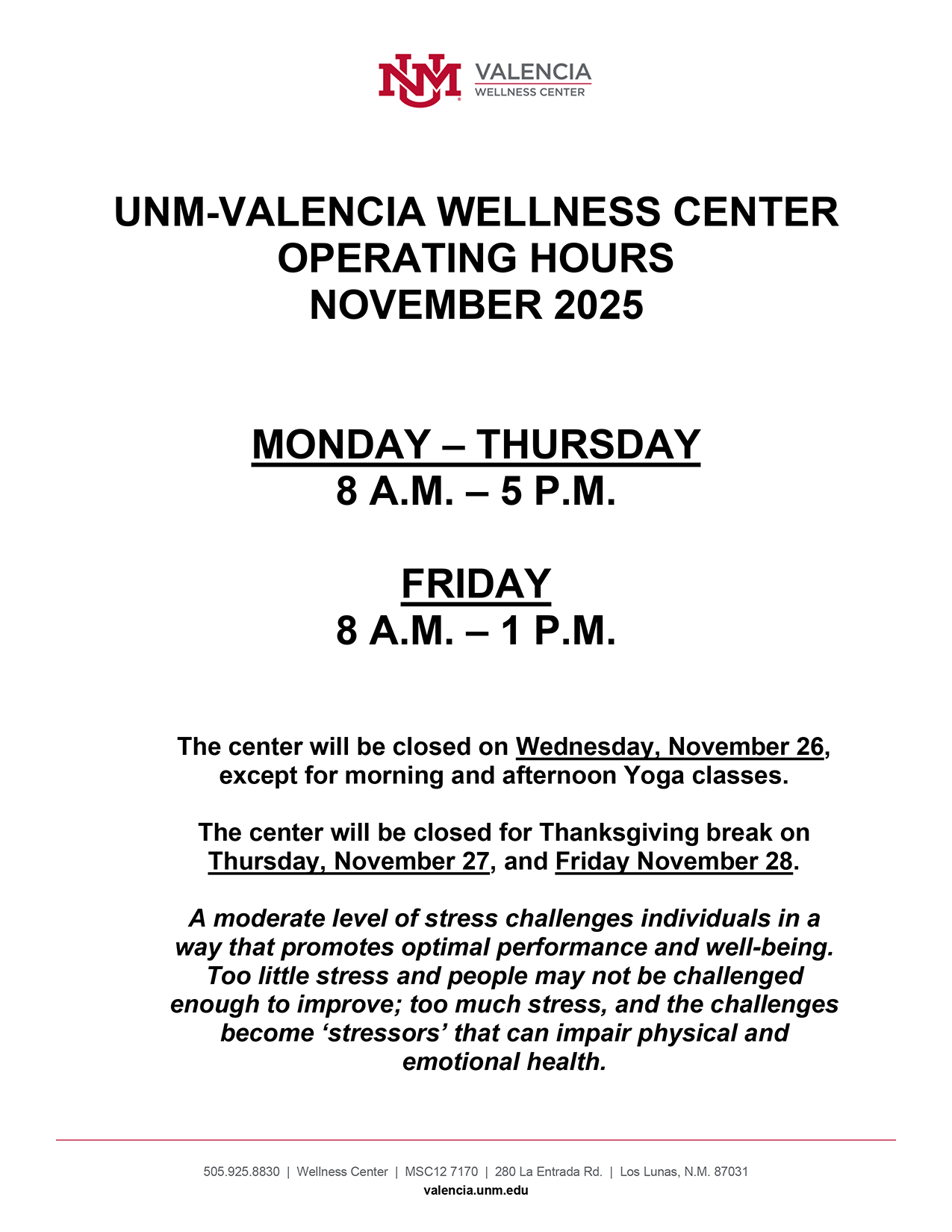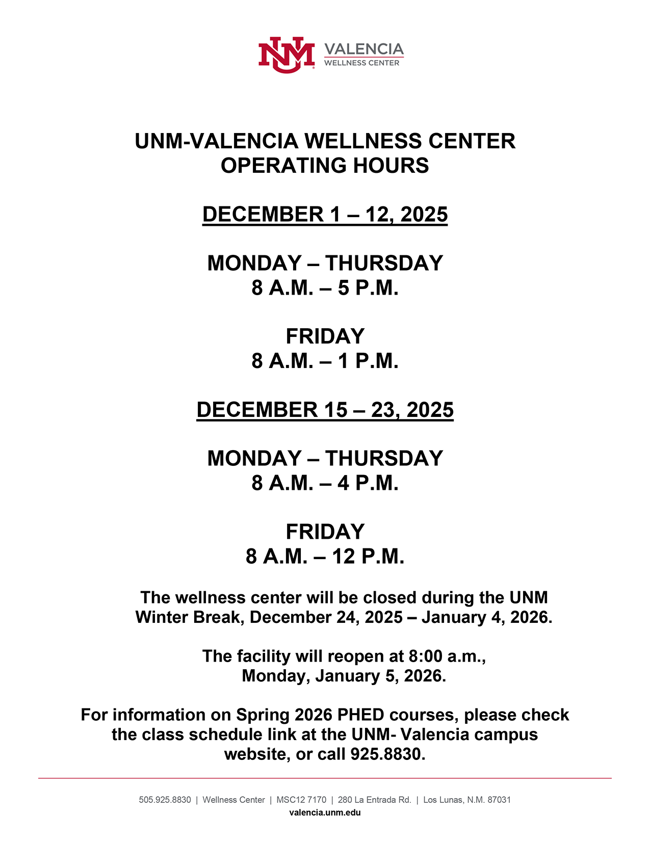 Please call 505.925.8830 or 505.925.8832 with questions about UNM-V Wellness Center programming, including the Community Access Plan.